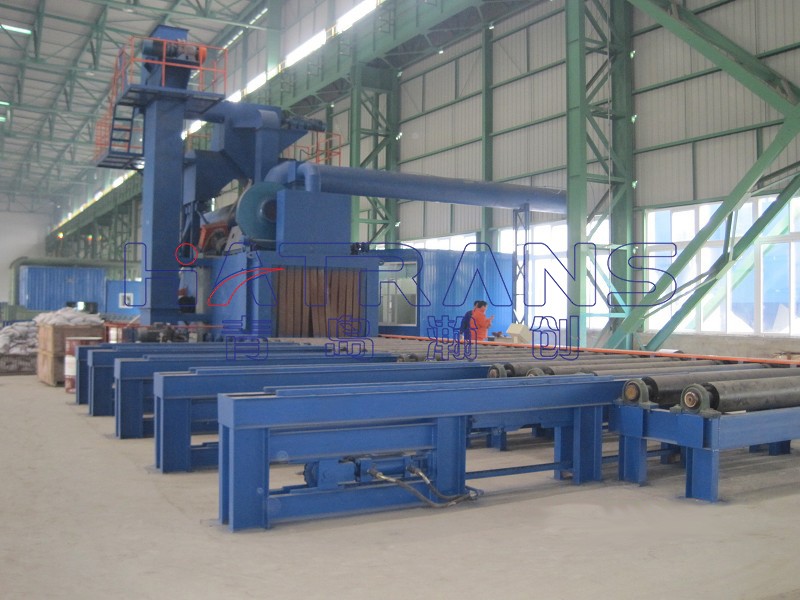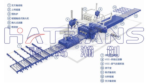 該系列鋼板、型材拋丸預(yù)處理線主要由預(yù)熱、拋丸處理、噴漆烘干工序組成。適用于船舶、汽車、機(jī)車車輛、橋梁、機(jī)械等行業(yè)的鋼板、型材及結(jié)構(gòu)件的表面除銹、涂漆工藝。