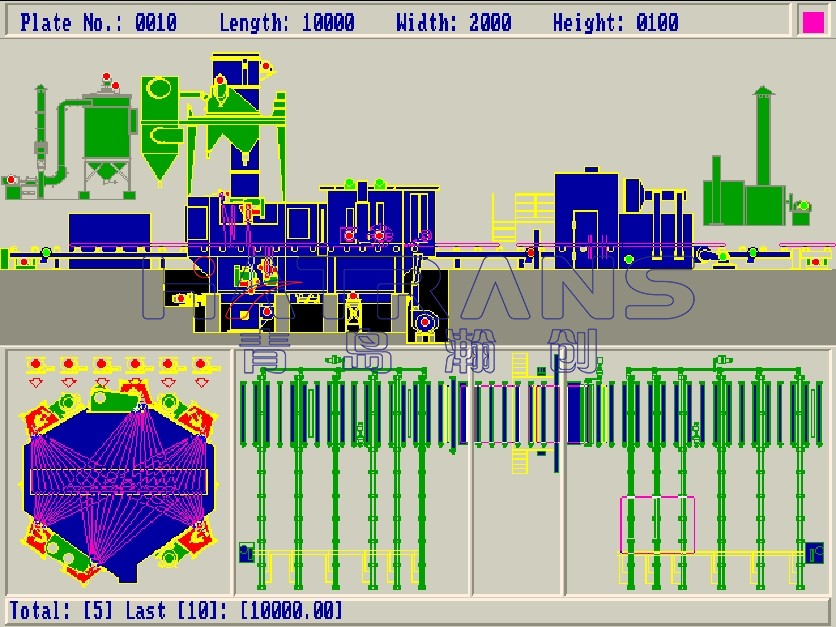 該生產(chǎn)線全線采用計(jì)算機(jī)監(jiān)控+PLC可編程序控制,采用移位存儲(chǔ)器和光電檢測,自動(dòng)測量鋼板厚度和寬度、自動(dòng)調(diào)整拋射帶的寬度和清掃裝置的升降高度,全線輥道多段變頻調(diào)速,可分段或全線微調(diào),實(shí)現(xiàn)了變載情況下的高精度同步輸送,保證了預(yù)處理鋼材的拋丸清理、噴漆烘干質(zhì)量。
