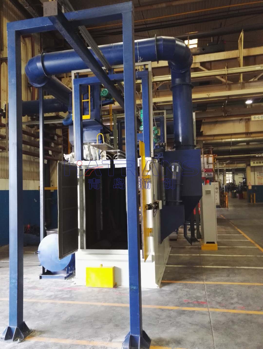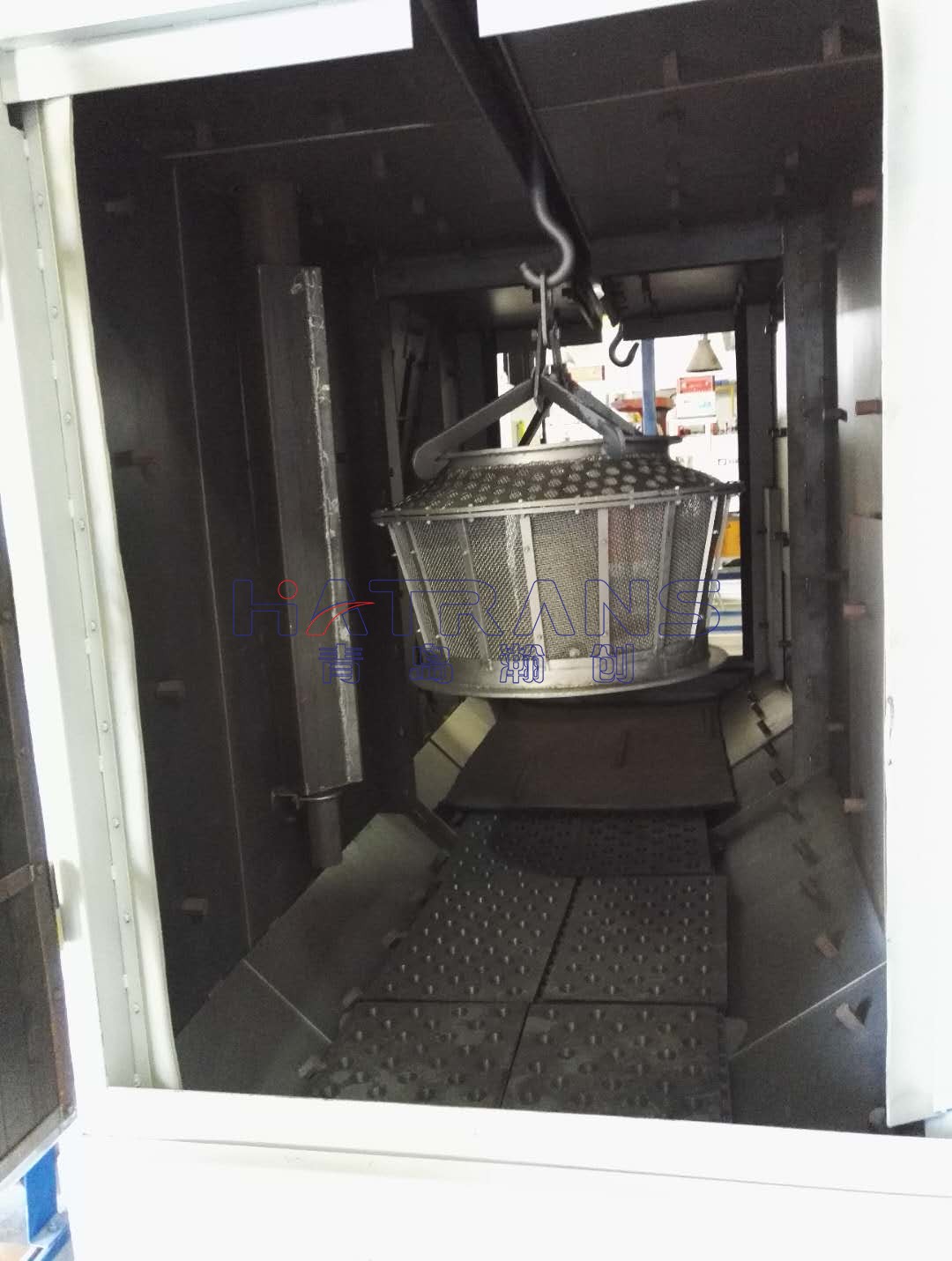 采用無地坑形式,特殊的吊鉤設(shè)計和行走旋轉(zhuǎn)驅(qū)動機構(gòu),尤其適用于復雜形狀鑄件的落砂和焊接結(jié)構(gòu)件的去除氧化皮,其效果超群